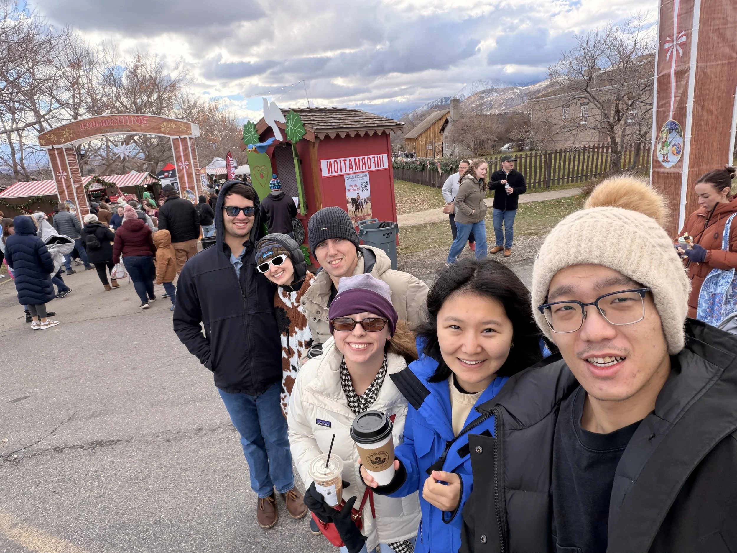 Graduate students Rachel (orange coat), Riley (green coat), and Emma (black coat) volunteering at the first Chemistry Night at the Museum hosted by the Natural History Museum of Utah